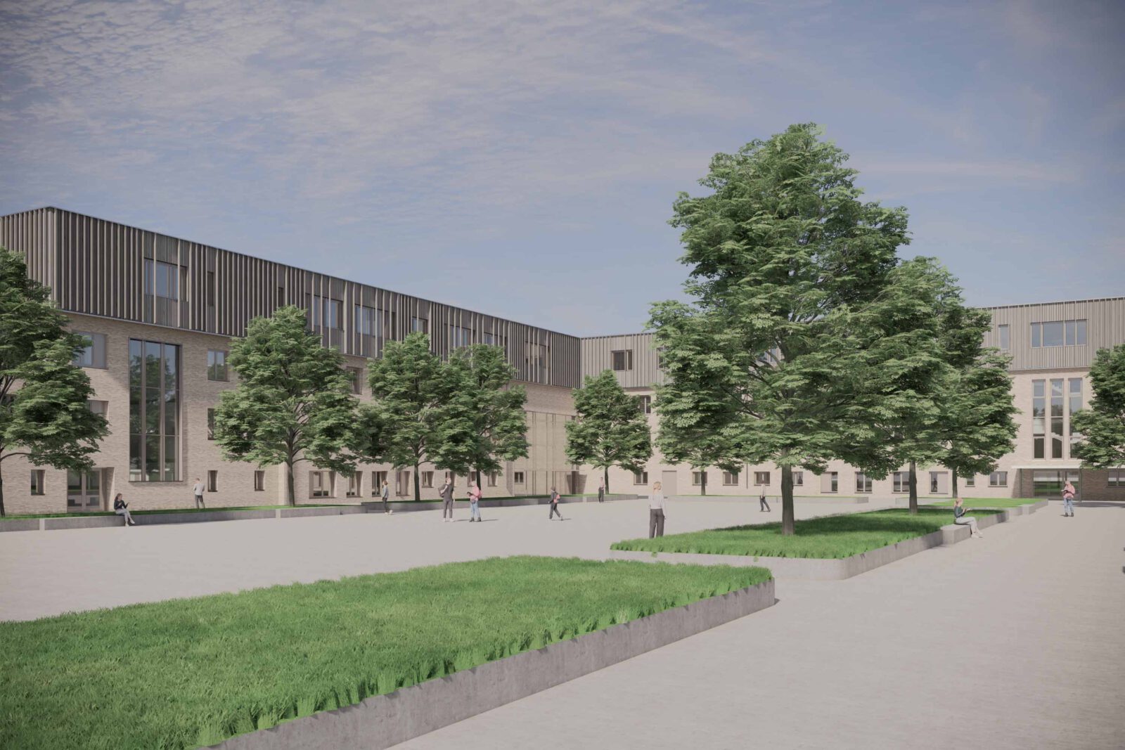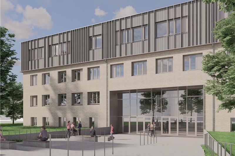Aufgrund von geänderten räumlichen Anforderungen und einer zukünftigen 5-zügigen Nutzung der ASR wird eine großzügige Erweiterung der Schule in Form einer kompletten Aufstockung um ein Vollgeschoss in Holzbauweise mit einem begrünten Flachdach realisiert. Der Holzbau wird als vorelementierte Konstruktion mit einer reinen Holzfassade konzipiert, alle Bestandteile sind sortenrein separierbar. Gleichzeitig findet eine energetische Sanierung der gesamten Gebäudehülle statt. Die Schule erhält zudem einen neuen Eingangsbereich mit einem zentralen Foyer und einer neuen Haupterschließung über ein großzügiges Treppenhaus mit einem Luftraum und einer Aufzugsanlage zur Herstellung der barrierefreien Erschließung. Die Belichtung der bestehenden Flure wird durch vergrößerte Türöffnungen mit Seitenteilen verbessert.